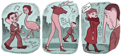 Une fois qu’on a dépassé la surprise de ces femmes à nez d’hommes et de ces hommes à poitrines saillantes, on comprend que Boinot parle d’identités et pas seulement de genres. Les emprunts troublent la définition identitaire du personnage dessiné. Puis, on remarque les décors parcellaires : le canapé, la table ou encore les fils qui illustrent un mouvement. Les nouvelles entités ont une vie propre, se choisissent des environnements, se meuvent à l’intérieur. Considérant des personnages culturellement indéfinis, il nous est alors permis d’explorer l’humanité hors de la culture : l’organique, les émotions primaires, ou encore les mouvements sans motivation, notamment.