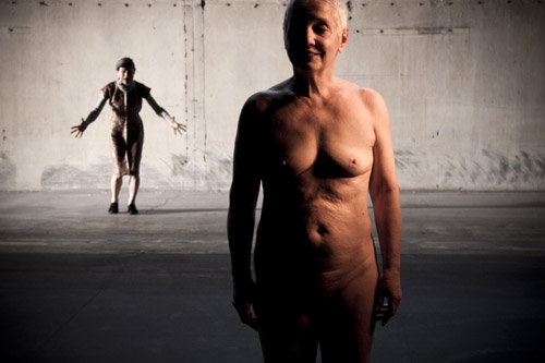 Sur scène, des acteurs, enfin dépouillés enfin de personnages. Quatre femmes, deux hommes. Elles sont vieilles, fragiles et fortes en même temps. L’une d’elles, totalement nue mais en mules, la soixantaine replète, va et vient, à petits pas sur le plateau, pour finir par réchauffer ses chairs au grand bec bunsen, comme sous un soleil de plomb. Son oubli est joyeux, sa sénilité, ingénue, presque émerveillée. Surgit alors son complet opposé : maigre, hystérique, le visage émacié, le sein décharné qui s’échappe de sa longue tunique bleue, elle alterne vociférations et silences inquiétants. Deux autres femmes encore, plus douces, partagent la scène. Plus mobiles, ces femmes-enfants ont les discours les plus composés. Elles se réjouissent, sautillent dans leurs ballerines, s’exercent à devenir femmes fatales…